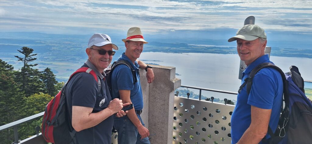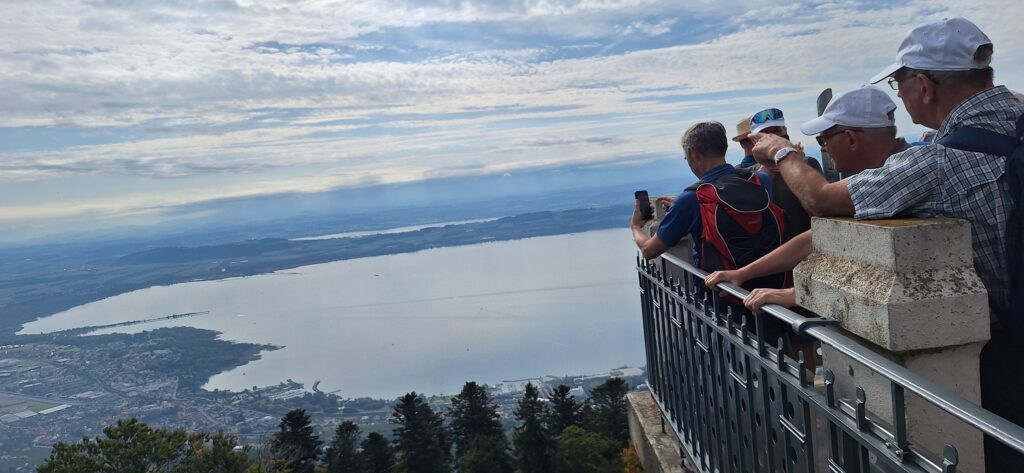Oben angekommen, auf 1100 m ü. M, zeigte sich vom Panoramaturm aus eine grandiose Aussicht auf das Drei-Seenland mit Murten-, Bieler- und Neuenburgersee.
